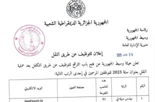 رئاسة الجمهورية وسيط الجمهورية مديرية الإدارة العامة ads إعلان للتوظيف عن طريق النقل 04 ديسمبر 2025 تعلن هيئة وسيط الجمهورية عن فتح باب الترشح للتوظيف عن طريق التكفل بعد عملية النقل بعنوان سنة 2025 للموظفين المرشحين في إحدى الرتب التالية: اعلان توظيف في مؤسسة …