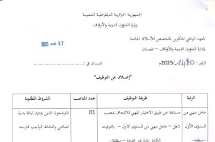 وزارة الشؤون الدينية والأوقاف المعهد الوطني للتكوين المتخصص للأسلاك الخاصة بإدارة الشؤون الدينية والأوقاف – تلمسان ads 07 دیسمبر 2025 إعلان عن توظيف الرتبةطريقة التوظيفعدد المناصبالشروط المطلوبةعامل مهني من المستوى الأول – منظمة –من مسابقة على طريق الاختبار المهني للالتحاق بمنصب عمل مهني من …