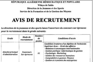 ولاية سعيدة مديرية الشباب والرياضة مصلحة التكوين وتسيير الوسائل ads إعلان توظيف إطلاق المديرية للشباب والرياضة فتح المسابقة على أساس الاختبارات للتوظيف في الرتبة التالية: (ترجمة لمعنى الجملة) الرتبةنمط التوظيفعدد المناصبشروط الالتحاقملحق رئيسي للإدارةمسابقة على أساس الاختبارات01المترشحون الحائزون على شهادة تقني سامي في :– …