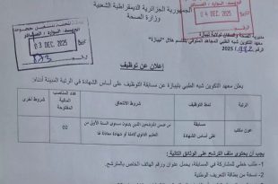 وزارة الصحة مديرية الصحة و السكان لولاية قالمة المؤسسة العمومية للصحة الجوارية وادي الزناتي ads إعلان عن توظيف تعلن المؤسسة العمومية للصحة الجوارية وادي الزناتي عن فتح مسابقة للتوظيف للإلتحاق بالرتب المبينة في الجدول أدناه: الرتبةعدد المناصبشروط الإلتحاقنمط التوظيفعون إدارة رئيسي02المترشحون الحائزون على شهادة …