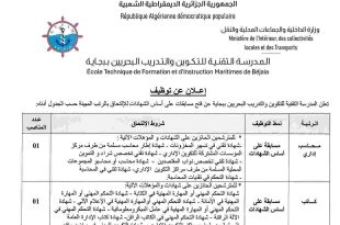 وزارة الداخلية والجماعات المحلية والتهيئة العمرانية المدرسة التقنية للتكوين والتدريب البحريين ببجاية ads إعلان عن توظيف تعلن المدرسة التقنية للتكوين والتدريب البحريين ببجاية عن فتح مسابقات على أساس الشهادات للالتحاق بالرتب المبينة حسب الجدول أدناه: الرتبةنمط التوظيفشروط الالتحاقعدد المناصبمحاسب إداريمسابقة على أساس الشهادات* للمترشحين …