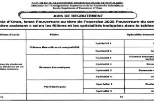 وزارة التعليم العالي والبحث العلمي المدرسة العليا للاقتصاد بوهران ads إعلان توظيف تعلن المدرسة العليا للاقتصاد بوهران، عن فتح مسابقة على أساس الشهادات للالتحاق برتبة «أستاذ مساعد قسم – ب» للعام المالي 2025 في الشعب والتخصصات المبينة في الجدول التالي: الرتبةنمط التوظيفشروط الالتحاقالشعبةالتخصصات المطلوبةعدد …