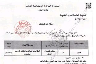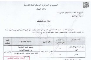 وزارة العدل المديرية العامة للموارد البشرية مديرية الموظفين ads إعلان عن توظيف تعلن وزارة العدل، المديرية العامة للموارد البشرية عن تنظيم توظيف عن طريق الاختبار المهني في رتبة عون خدمة من المستوى الأول وحارس لفائدة مجلس قضاء ورقلة، كما هو مبين في الجدول أدناه: …