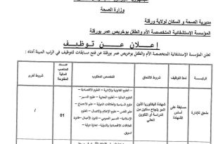 وزارة الصحة مديرية الصحة و السكان لولاية ورقلة المؤسسة الإستشفائية المتخصصة الأم والطفل بوخريص عمر بورقلة ads إعــــلان عــــن تـوظـيـف تعلن المؤسسة الإستشفائية المتخصصة الأم والطفل بوخريص عمر بورقلة عن فتح مسابقات للتوظيف في الرتب المبينة أدناه : الرتبةنمط التوظيفشروط الالتحاقالتخصص المطلوبعدد المناصب المالية …