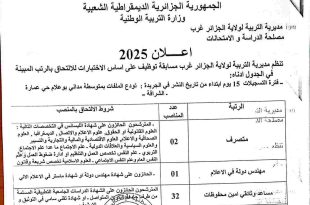 اعلان عن توظيف مديرية التربية لولاية الجزائر غرب ads تعلن مديرية التربية للجزائر العاصمة غرب عن مسابقة توظيف على أساس الإختبارات و على أساس الإختبارات المهنية ب (شرط الإقامة بإحدى الدوائر التالية : الشراقة، بئر مراد رايس، بئرتوتة، الدرارية، زرالدة و سيدي عبد الله) …