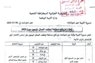 وزارة التربية الوطنية مديرية التربية لولاية بجاية مصلحة التوجيه والامتحانات ads إعلان عن توظيف تعلن مديرية التربية لولاية بجاية عن فتح مسابقة توظيف على أساس الاختبارات بعنوان 2025 للالتحاق بمناصب الشغل التالية: منصب الشغلنمط التوظيفالشروط المطلوبة / الشهادةالعدد الإجمالي للمناصب الماليةكاتب مديريةعلى أساس الاختباراتالحائزون …