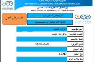 وزارة العمل والتشغيل والضمان الاجتماعي، الفرع الولائي للتشغيل بتمنراست الملحقة المحلية للتشغيل بتمنراست ads عرض عمل يعلن الفرع الولائي والملحقة المحلية للتشغيل بتمنراست، عن توفر عروض عمل لدى مؤسسة الجزائرية للمياه، بتاريخ 06/01/2026، بعقود عمل محددة المدة (CDD)، وذلك في التخصصات التالية: منصب إلكتروميكانيكي …