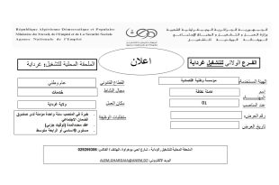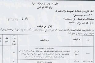 وزارة العمل والتشغيل والضمان الاجتماعي الوكالة الوطنية للتشغيل الفرع الولائي للتشغيل: باتنة الملحقة المحلية للتشغيل: باتنة ads عرض عمل الهيئة المستخدمة: ADE UNITE DE PROD KOUDIET MEDDOUAR القطاع القانوني: PUBLIC تاريخ التسجيل: 19/01/2026 عدد المناصب: 1 المهنة المطلوبة: Ingénieur chimiste en industrie مكان العمل: …