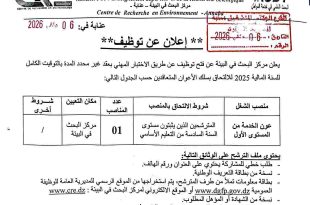 وزارة التعليم العالي والبحث العلمي المديرية العامة للبحث العلمي والتطوير التكنولوجي مركز البحث في البيئة – عنابة – ads عنابة في: 06 جانفي 2026 إعلان عن توظيف يعلن مركز البحث في البيئة عن فتح توظيف عن طريق الاختبار المهني بعقد غير محدد المدة بالتوقيت …