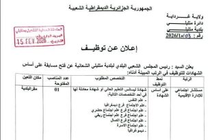 وزارة الداخلية والجماعات المحلية والتهيئة العمرانية صندوق التضامن والضمان للجماعات المحلية الفرع الولائي للتشغيل بالجزائر ads يوم: 10 فيفري 2026 إعلان عن توظيف يعلن صندوق التضامن والضمان للجماعات المحلية عن فتح مسابقة على أساس الشهادات للالتحاق بالمناصب التالية: الرتبةنمط التوظيفشروط الالتحاقعدد المناصب المالية المفتوحةمكان …