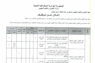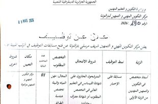 وزارة التكوين والتعليم المهنيين المعهد الوطني المتخصص في التكوين المهني للتبريد “قارة عبد العزيز” بئر مراد رايس (م.ت.ت سابقاً) ads إعلان الجزائر في: 01 مارس 2026 يعلن المعهد الوطني المتخصص في التكوين المهني للتبريد بئر مراد رايس عن التوظيف في المناصب التالية: الرقمالرتبةعدد المناصب …