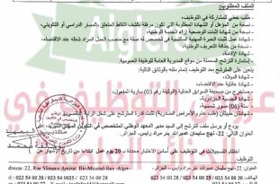 وزارة العمل والتشغيل والضمان الاجتماعي الوكالة الوطنية للتشغيل الفرع الولائي للتشغيل بالجلفة الملحقة المحلية للتشغيل بالجلفة ads عرض عمل المؤسسة المستخدمة: COSIDER CANALISATION POLE C57 القطاع القانوني: عام تاريخ العرض: 2026/03/01 عدد المناصب: 16 شروط العرض: الوضعية القانونية تجاه الخدمة الوطنية – الإقامة بالمجاورة …