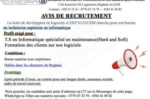 إعلان توظيف ads تبحث شركة NGNEX08 لتطوير البرمجيات وأنظمة تخطيط موارد المؤسسات (ERP) لمكتبها عن: تقني سامي في الإعلام الآلي الملف المطلوب: شهادة تقني سامي في الإعلام الآلي متخصص في الصيانة (المادية والبرمجية) تكوين العملاء على برامجنا الشروط: إتقان جيد مع خبرة يقيم في …
