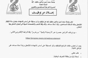 وزارة التعليم العالي والبحث العلمي جامعة محمد لمين دباغين سطيف 02 الأمانة العامة المديرية الفرعية للمستخدمين والتكوين ads إعلان عن توظيف تعلن جامعة محمد لمين دباغين سطيف 02 عن توظيف و/أو مسابقة على أساس الشهادات بعنوان سنة 2025 للالتحاق بسلك الأساتذة المساعدين رتبة: أستاذ …