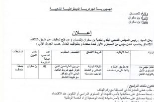 اعلانات توظيف الولايات المعنية: الجزائر العاصمة، بومرداس، تيبازة، البليدة، سطيف، قسنطينة، تيسمسيلت، ايليزي، باتنة، مستغانم، تندوف، تمنراست، بشار، غليزان، الشلف، الجلفة، وهران يرجى من المهتمين التقرب من الادارة المعنية بالعرض او الملحقة المحلية للتشغيل حسب طبيعة الاعلان ads المدرسة الوطنية العليا للفلاحة إعلان توظيف …