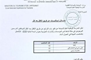 وزارة السياحة والصناعة التقليدية المديرية الوطنية العليا للسياحة المديرية العامة المدرسة الوطنية العليا للسياحة ads إعلان توظيف عن طريق التكفل بعد نقل تعلن المديرية الوطنية العليا للسياحة عن فتح باب الترشح عن طريق التكفل بعد النقل للموظفين المرسمين الموجودين في حالة نشاط لدى المؤسسات …