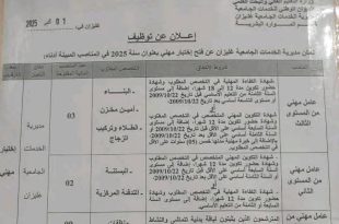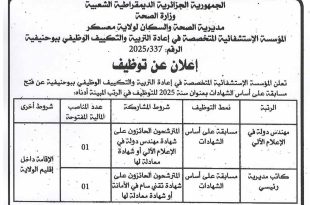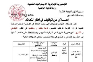 وزارة التربية الوطنية مديرية التربية لولاية خنشلة ads خنشلة في 05/10/2025 إعــلان عن توظيف في إطار التعاقد نظراً لاستنفاذ القوائم الاحتياطية في المنصة التعاقد في الأرضية الوطنية للرقمنة التابعة لوزارة التربية الوطنية تخصص تربية بدنية و رياضية في الطور الابتدائي و الثانوي، تعلن مديرية …