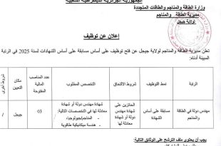 وزارة الطاقة والمناجم والطاقات المتجددة مديرية الطاقة والمناجم لولاية جيجل مديرية الطاقة والمناجم لولاية بومرداس ads إعلان عن توظيف تعلن مديرية الطاقة والمناجم عن فتح توظيف على أساس مسابقة على أساس الشهادات لسنة 2025 في الرتبة المبينة أدناه: إعلان عن توظيف بالمجلس الأعلى للشباب: …