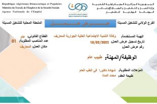 الجمهورية الجزائرية الديمقراطية الشعبية وزارة العمل والتشغيل والضمان الاجتماعي الوكالة الوطنية للتشغيل الفرع الولائي للتشغيل المسيلة الملحقة المحلية للتشغيل عين الملح ads عرض عمل بالتعويض الهيئة المستخدمة: وكالة التنمية الاجتماعية ADS القطاع القانوني: عام الوظيفة / المهنة: طبيب عدد المناصب المطلوبة: 01 مكان العمل: …