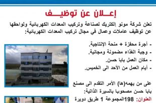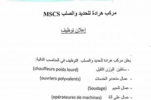 إعلان توظيف مركب هرادة للحديد والصلب ads مركب هرادة للحديد والصلب MSCS يعلن عن فتح باب التوظيف لشغل المناصب التالية: سائقين للوزن الثقيل (Chauffeurs poids lourd) عمال متعددة الخدمات (Ouvriers polyvalents) عمال تلحيم (Soudage) عمال على آلة (Opérateurs de machines) مكان العمل: المنطقة الصناعية …