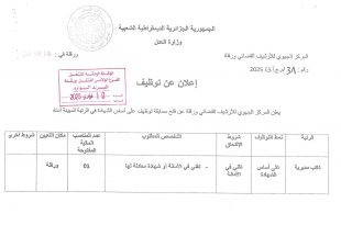 اعلان توظيف ن ع 6 ads مكان العمل اوتول/ الوحدة الجهوية للبناء ن ع 6على الراغبين في العمل ايداع ملفاتهم لدى مقر الوحدة الجهوية للبناء اوتول الشروطمكان الإقامةالمنصبشهادة التكوين المهني في الاختصاصتمنراستحدائدي (ferrailleur)بناء (macon)مهيكل (coffreur) ملاحظة: الإقامة في ولاية تمنراست وضواحيها + شهادة في …