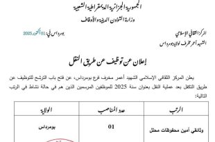 وزارة الشؤون الدينية والأوقاف بومرداس في: 01 أكتوبر 2025 المركز الثقافي الإسلامي ads إعلان عن توظيف عن طريق النقل يعلن المركز الثقافي الإسلامي الشهيد أعمر مخرف فرع بومرداس، عن فتح باب الترشح للتوظيف عن طريق التكفل بعد عملية النقل بعنوان سنة 2025 للموظفين المرسمين …