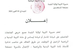 وزارة التربية الوطنية مديرية التربية لولاية البليدة مصلحة المستخدمين ads البليدة في: 02 أكتوبر 2025 إعلان تعلم مديرية التربية لولاية البليدة جميع خريجي الجامعات الحاصلين على شهادة الماستر أو شهادة ليسانس في مادة التربية البدنية و الرياضية الراغبين في التوظيف عن طريق التعاقد على …