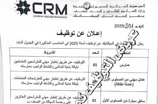 وزارة التعليم العالي و البحث العلمي مركز البحث في الميكانيك ads إعلان عن توظيف يعلن مركز البحث في الميكانيك عن توظيف لسنة 2025 في المناصب المذكورة في الجدول أدناه: المنصبالعددالشروطحارس01التوظيف عن طريق إختيار مهني للمترشحين المتمتعين بلياقة بدنية تتماشى والنشاط الواجب ممارستهعامل مهني من …