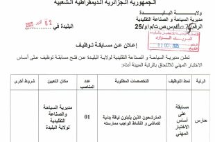ولاية البليدة مديرية السياحة والصناعة التقليدية ads البليدة في 02 أكتوبر 2025 إعلان عن مسابقة توظيف تعلن مديرية السياحة والصناعة التقليدية لولاية البليدة عن فتح مسابقة توظيف على أساس الاختبار المهني للالتحاق بالرتبة المبينة أدناه: الرتبةنمط التوظيفالتخصصات المطلوبةعدد المناصبمكان التعيينشروط أخرىحارسمسابقة على أساس الاختبار …