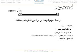 وزارة العمل و التشغيل و الضمان الإجتماعي الوكالة الوطنية للتشغيل الفرع الولائي للتشغيل بالجلفة الملحقة المحلية للتشغيل بالجلفة ads إعلان الجلفة في 2025/10/02 مؤسسة عمومية تبحث عن مرشحين لشغل منصب منظفة متطلبات المنصب: الإقامة ببلدية المجاورة. السن 40 سنة على الأقل. و عليه تمن …