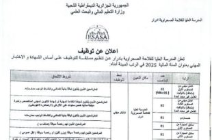 وزارة التعليم العالي والبحث العلمي المدرسة العليا للفلاحة الصحراوية أدرار ads إعلان عن توظيف تعلن المدرسة العليا للفلاحة الصحراوية أدرار عن تنظيم مسابقة للتوظيف على أساس الشهادة وعلى أساس الاختبار بعنوان السنة المالية 2025 في الرتب المبينة أدناه: إعلان عن توظيف بالمجلس الأعلى للشباب: الجزائر العاصمة، …