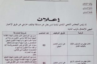 أكمل القراءة »إعلان عن توظيف في بلدية تنس ولاية الشلف