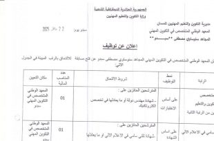 الجمهورية الجزائرية الديمقراطية الشعبية وزارة التكوين والتعليم المهنيين مديرية التكوين والتعليم المهنيين تلمسان المعهد الوطني المتخصص في التكوين المهني المجاهد سنوساوي مصطفى سيدو ads إعلان عن توظيف يعلن المعهد الوطني المتخصص في التكوين المهني المجاهد سنوساوي مصطفى سيدو عن فتح مسابقة للالتحاق بالرتب المبينة …