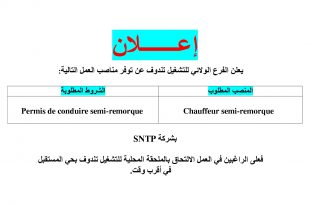 إعلان ads يعلن الفرع الولائي للتشغيل تندوف عن توفر المناصب العمل التالية: المنصب المطلوبالشروط المطلوبةNiveleuse (مشغل آلة التسوية)Diplôme ou certificat de travail (شهادة أو شهادة عمل) بمؤسسة إنجاز الطرقات والمطارات SERA فعلى الراغبين في العمل الالتحاق بالملحقة المحلية للتشغيل تندوف بحي المستقبل في أقرب …