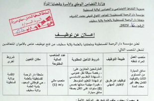 الجمهورية الجزائرية الديمقراطية الشعبية وزارة التضامن الوطني والأسرة وقضايا المرأة مديرية النشاط الاجتماعي والتضامن لولاية قسنطينة مؤسسة دار الرحمة لقسنطينة المجاهد المتوفي قنيفي محمد الشريف ملحقة دار الرحمة لقسنطينة بالعلمة ولاية سطيف ads إعلان عن توظيف تعلن مؤسسة دار الرحمة لقسنطينة وملحقتها بالعلمة ولاية …