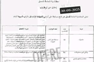 وزارة العمل والتشغيل والضمان الاجتماعي المفتشية العامة للعمل ads إعلان عن توظيف 30-09-2025 تعلن المفتشية العامة للعمل عن فتح مسابقة على أساس الشهادة للإلتحاق بالرتب المبينة أدناه: الرتبةعدد المناصبنمط التوظيفشروط الإلتحاقمتصرف02مسابقة على أساس الشهادةالحائزون على شهادة الليسانس في الميادين والتخصصات التالية: الحقوق، العلوم الاقتصادية …