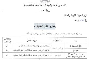 وزارة العدل مركز البحوث القانونية والقضائية ads إعلان عن توظيف يعلن مركز البحوث القانونية والقضائية عن فتح مسابقة للتوظيف الخارجي في الرتب المبينة أدناه: عدد المناصب المالية المفتوحةشروط الالتحاقنمط التوظيفالرتبوثائقي أمين محفوظات– شهادة ليسانس في علم اقتصاد المخططات أو شهادة معادلة لها.على أساس الشهادات01عون …