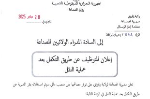 وزارة الصناعة ولاية إيليزي مديرية الصناعة مصلحة إدارة الوسائل ads إعلان للتوظيف عن طريق التكفل بعد عملية النقل تعلن مديرية الصناعة لولاية إيليزي عن توفر مناصب مالية سيتم استغلاله بمقر المديرية عن طريق التكفل بعد عملية النقل في الرتبة التالية: مهندس رئيسي في الإعلام …