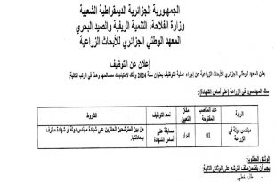 الجمهورية الجزائرية الديمقراطية الشعبية وزارة الفلاحة، التنمية الريفية والصيد البحري المعهد الوطني الجزائري للأبحاث الزراعية ads إعلان عن التوظيف يعلن المعهد الوطني الجزائري للأبحاث الزراعية عن إجراء عملية التوظيف بعنوان سنة 2024 وذلك لاحتياجات مصالحه، وهذا في الرتبة التالية: سلك المهندسون في الزراعة (على …