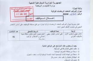 الجمهورية الجزائرية الديمقراطية الشعبية وزارة الشباب والرياضة ولاية تيبازة الملحقة المحلية للتشغيل تيبازة ديوان المركب المتعدد الرياضات لولاية تيبازة ads التاريخ: 07 جانفي 2025 إعلان توظيف تعلن مديرية ديوان المركب المتعدد الرياضات لولاية تيبازة عن فتح مسابقة للتوظيف على أساس الاختبار المهني في منصب …