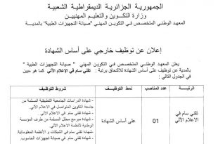 الجمهورية الجزائرية الديمقراطية الشعبية وزارة التكوين والتعليم المهنيين المعهد الوطني المتخصص في التكوين المهني “صيانة التجهيزات الطبية” بالمدية ads إعلان عن توظيف خارجي على أساس الشهادة يعلن المعهد الوطني المتخصص في التكوين المهني “صيانة التجهيزات الطبية” بالمدية عن توظيف على أساس الشهادة للالتحاق برتبة: …