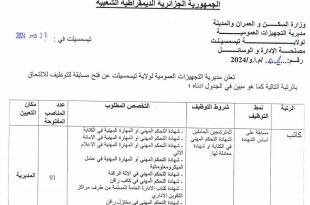 الجمهورية الجزائرية الديمقراطية الشعبية وزارة السكن والعمران والمدينة مديرية التجهيزات العمومية ولاية تيسمسيلت مصلحة الإدارة والوسائل ads إعلان عن فتح مسابقة للتوظيف تعلن مديرية التجهيزات العمومية لولاية تيسمسيلت عن فتح مسابقة للتوظيف للالتحاق بالرتبة التالية كما هو مبين في الجدول أدناه: الرتبةنمط التوظيفشروط التوظيفالتخصص …