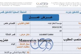 الجمهورية الجزائرية الديمقراطية الشعبية وزارة العمل والتشغيل والضمان الاجتماعي الوكالة الوطنية للتشغيل الفرع الولائي للتشغيل تيارت الملحقة المحلية للتشغيل قصر الشلالة ads عرض عمل الهيئة المستخدمةالقطاع القانونيتاريخ التسجيلعدد المناصبمكان العرضرقم عرض العملمؤسسة أشغال البناءاقتصادي خاص2024/12/3019قصر الشلالة14140007/24004 المهنة/المنصب المطلوبمجال النشاطنوع العقدمتطلبات المنصبالمؤهلات المطلوبةعامل بسيط (Manoeuvre …
