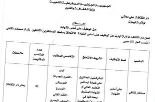 الجمهورية الجزائرية الديمقراطية الشعبية وزارة الثقافة والفنون دار الثقافة علي معاشي لولاية تيارت ads إعلان عن توظيف على أساس الشهادة تعلن دار الثقافة لولاية تيارت عن توظيف على أساس الشهادة للالتحاق بسلك المستشارين الثقافيين رتبة مستشار ثقافي منصب شغل (01) محرر. المنصبعدد المناصب المفتوحةالتخصص …