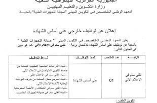 إعلان عن توظيف على أساس الشهادة في المعهد الوطني المتخصص في التكوين المهني صيانة التجهيزات الطبية بالمدية