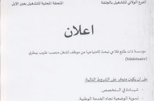 الملحقة المحلية للتشغيل بعين الإبل الفرع الولائي للتشغيل بالجلفة ads إعلان مؤسسة ذات طابع فلاحي تبحث لاحتياجها عن موظف لشغل منصب: طبيب بيطري (Vétérinaire) على أن يكون متوفر على الشروط التالية: شهادة في التخصص. تسوية الوضعية تجاه الخدمة الوطنية. يتقن الإعلام الآلي. له القابلية …