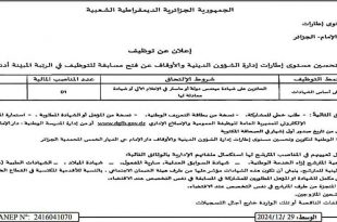 ads الجمهورية الجزائرية الديمقراطية الشعبية المدرسة الوطنية لتكوين وتحسين مستوى إطارات إدارة الشؤون الدينية والأوقاف – دار الإمام – الجزائر إعلان عن توظيف تعلن المدرسة الوطنية لتكوين وتحسين مستوى إطارات إدارة الشؤون الدينية والأوقاف عن فتح مسابقة للتوظيف في الرتبة المبينة أدناه: الرتبةنمط التوظيفشروط …