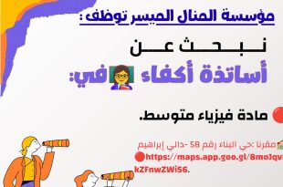 École Privée المنال الميسر ads إعلان توظيف تعلن مؤسسة المنال الميسّر التعليمية عن فتح باب التوظيف للأساتذة (ذكورًا أو إناثًا) في مادة الفيزياء – طور المتوسط يشترط أن يكون المترشح ذو خبرة خاصة مع أقسام الرابعة متوسط. يُرجى من الراغبين في الانضمام إلى طاقمنا …