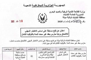 وزارة الفلاحة والتنمية الريفية والصيد البحري المديرية العامة للغابات محافظة الغابات لولاية ميلة ميلة في: 13 نوفمبر 2025 ads إعلان عن فتح مسابقة على أساس الإختيار المهني للإلتحاق برتبة حارس بعقد غير محدد المدة بالتوقيت الكامل تعلن محافظة الغابات لولاية ميلة عن فتح مسابقة …