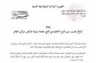 أكمل القراءة »إعلان عن فتح الترشح لمنصب مسير الفرع الاقتصادي بجامعة سعيدة